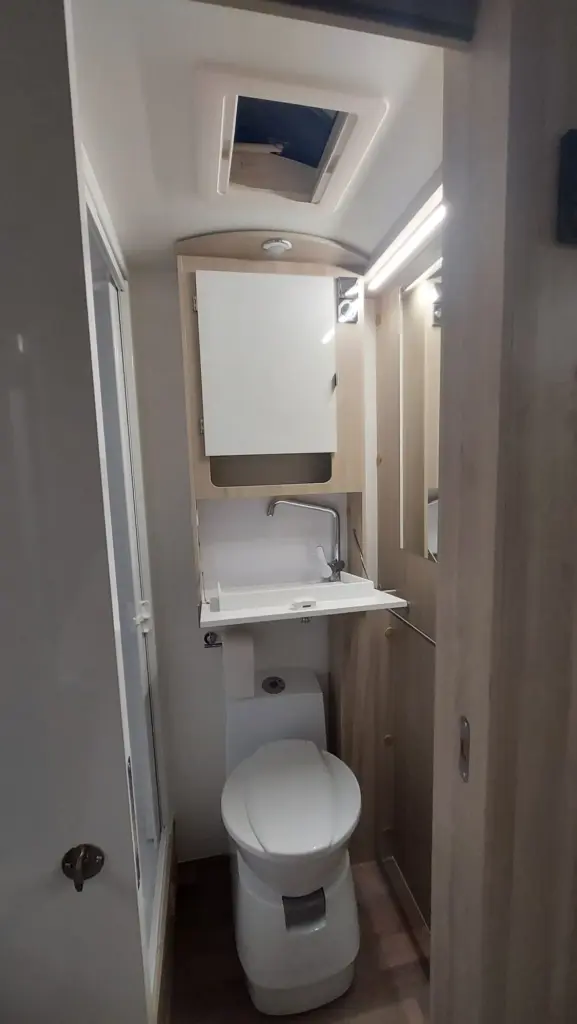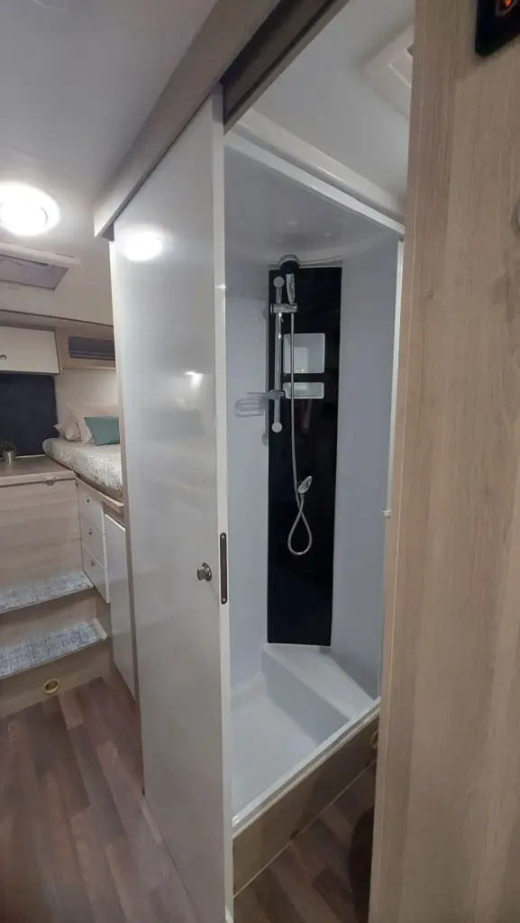 Baño con lavabo plegable y mampara: disfruta de una ducha relajante tras un día de ruta.