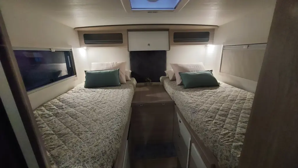 Zona de Descanso: camas gemelas convertibles en King Size + cama doble abatible del techo.