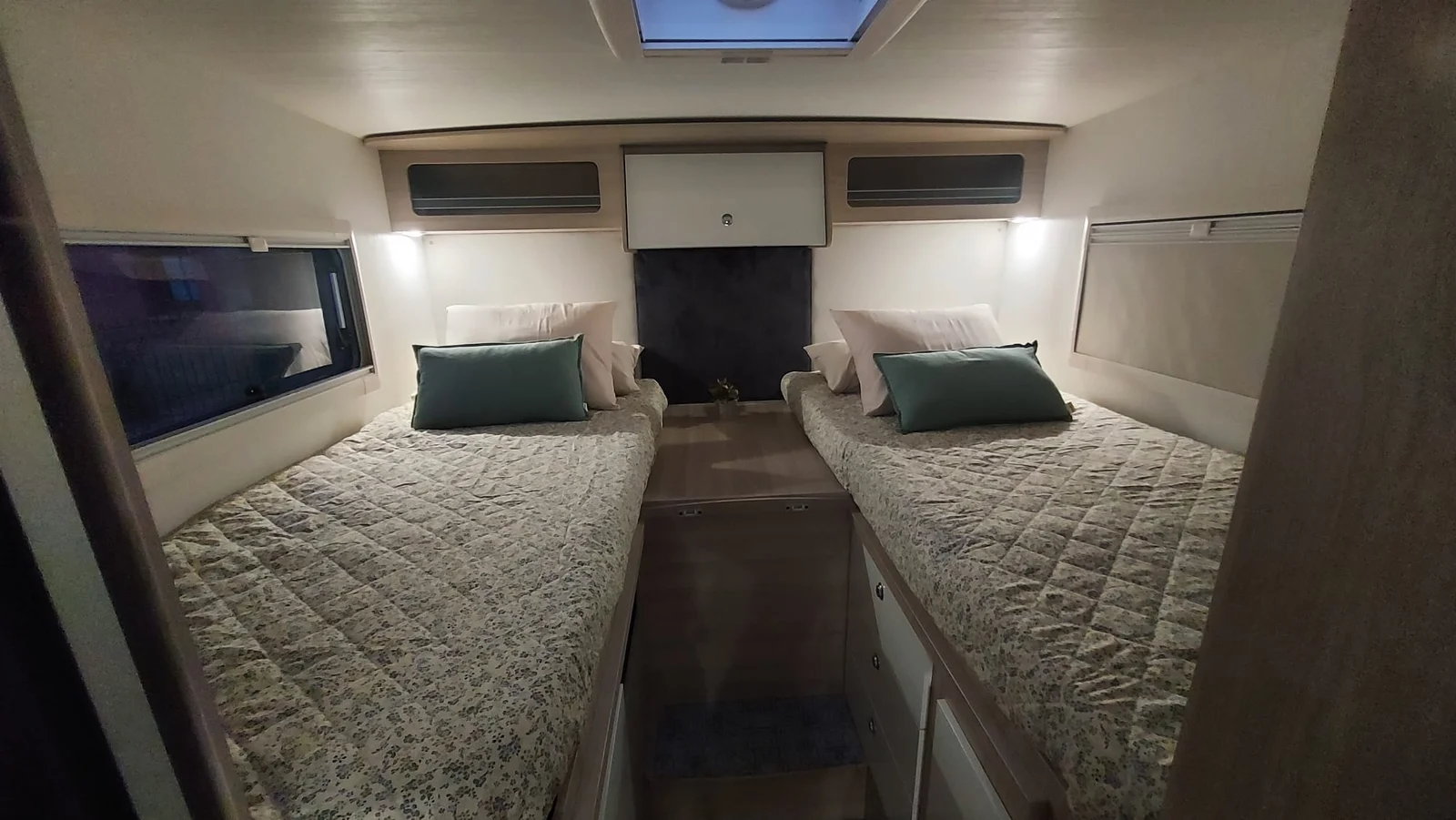 Camas gemelas que se transforman en cama King Size para un descanso perfecto. Cama doble abatible del techo para ganar espacio cuando lo necesites.